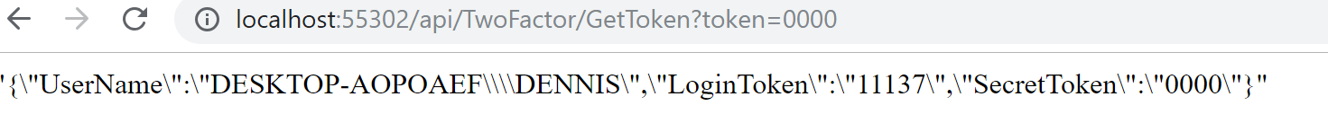 TwoFactor twoFactor = new TwoFactor(); Random random = new Random(); int tempToken = random.Next(10000,88888) + DateTime.Now.Second; string secretToken = tempToken.ToString(); list[0].Login_Token = secretToken; service.Update(ref list[0]); twoFactor.UserName = list[0].User_ID; twoFactor.SecretToken = list[0].Secret_Token; twoFactor.LoginToken = list[0].Login_Token; return Ok(JsonConvert.SerializeObject(twoFactor));
